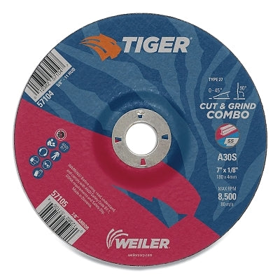 Weiler 57105 Tiger AO Type 27 Cut/Grind Combo Wheel, 7 in dia, 1/8 in thick, 7/8 in dia arbor, Grit 30, Aluminum Oxide