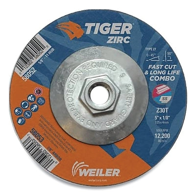 Weiler 58053 Tiger Zirc Type 27 Cut/Grind Combo Wheel, 5 in dia, 1/8 in thick, 7/8 in dia arbor, Grit 30, Zirconia Alumina
