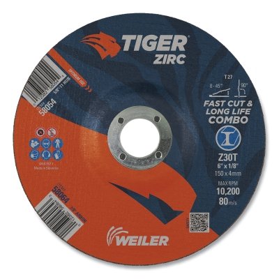 Weiler 58064 Tiger Zirc Type 27 Cut/Grind Combo Wheel, 6 in dia x 1/8 in Thick, 7/8 in dia Arbor, Z30T