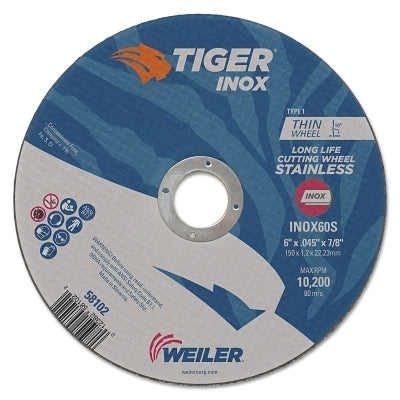 Weiler 58102 Tiger Inox Thin Cutting Wheel, 6 in Dia, .045 in Thick, 7/8 in Arbor