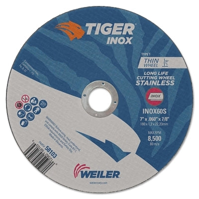 Weiler 58103 Tiger Inox Thin Cutting Wheel, Type 1, 7 in Diameter, 0.060 in Thick, 7/8 in Arbor