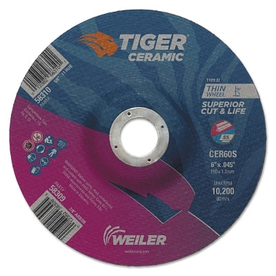 Weiler 58309 Tiger Ceramic Cutting Wheels, 6 in Dia, 0.045 in Thick, 7/8 in Arbor, 24/bx