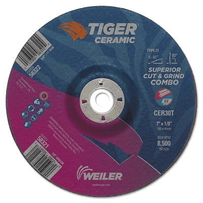 Weiler 58321 Tiger Ceramic Combo Wheels, 7 in Dia., 1/8 in Thick, 7/8 in Arbor, 30 Grit