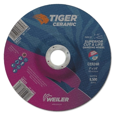 Weiler 58331 Tiger Grinding Wheel, 7 in dia x 1/4 in Thick x 7/8 in Arbor, 24 Grit, Ceramic Alumina, Type 27, 10 EA/BX