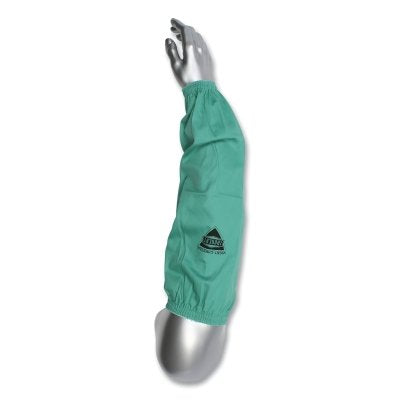 Key features include: flame-resistant fabric for reliable heat protection, sateen cotton construction for breathability and durability, generous length for full arm coverage, and elasticized ends for a customized fit. The striking green color not only identifies safety compliance but also adds visibility in the workplace.
