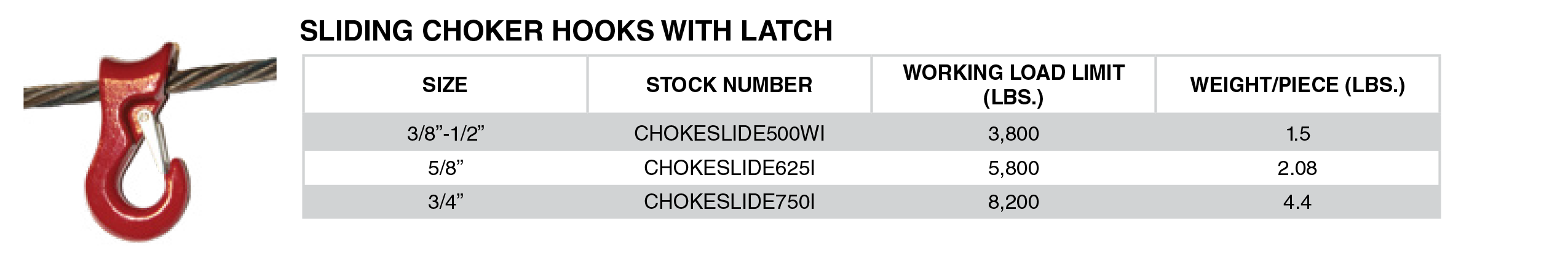 x100 CHOKESLIDE750I SLIDING CHOKER HOOKS WITH LATCH